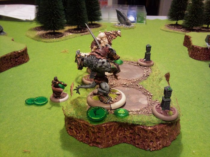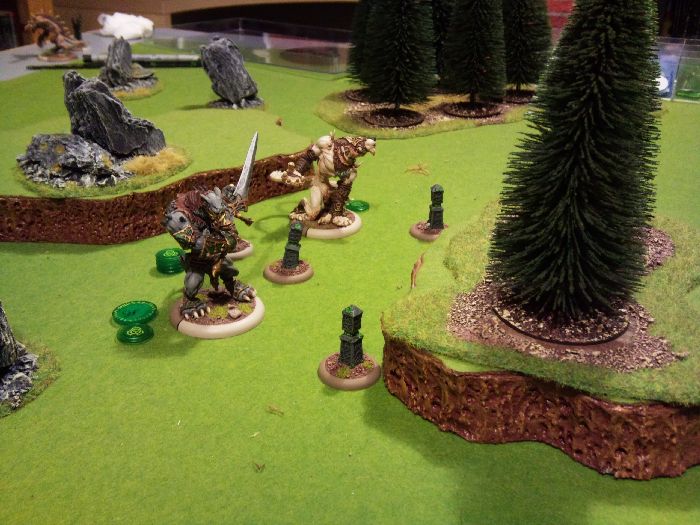 At first my plan was to get the alpha strike and to take out one of his Warjacks by attacking it with both my beasts. That’s why I positioned them close to each other in the forest, but far enough back from the enemy so that I wouldn't receive the charge.