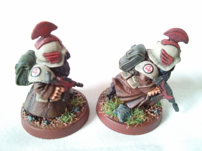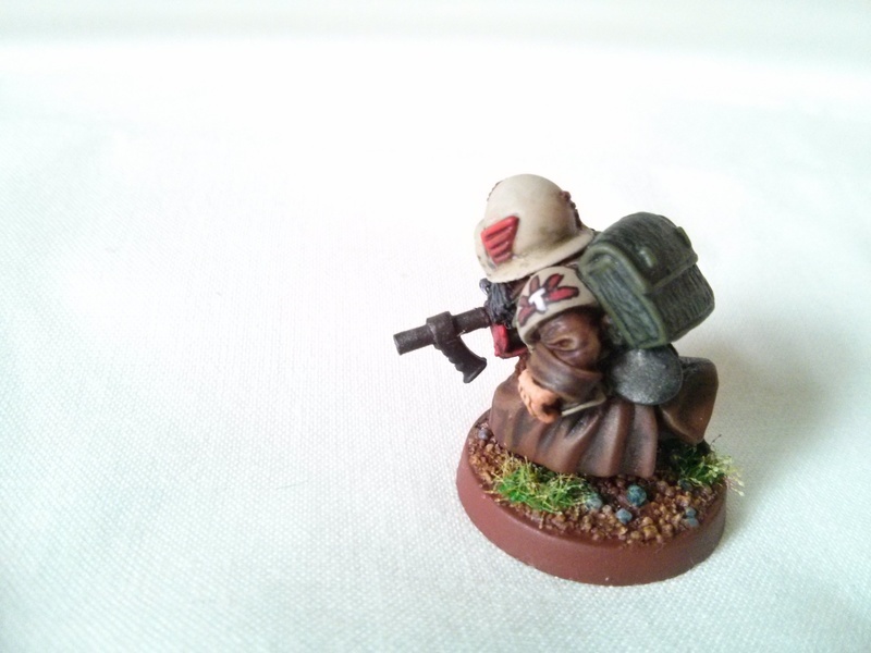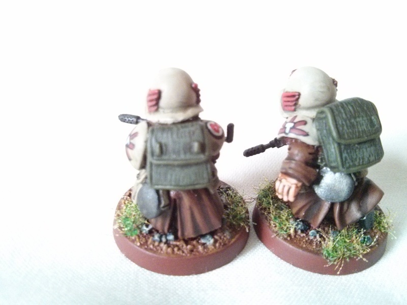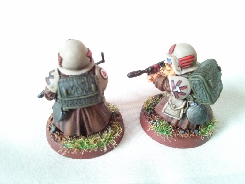 This squad is a sapper squad, trained by the Guild (allowing me to use their hammer symbol on the shoulder pads) on placing charges and blowing things up (as shown by the stylised explosing upon the front of their helmets and repeated below the hammer on their shoulder pad). The backpacks contain mainly exlosives and detonators. Due to their special training they also have access to more unusual weapons in the form of bolt guns, as